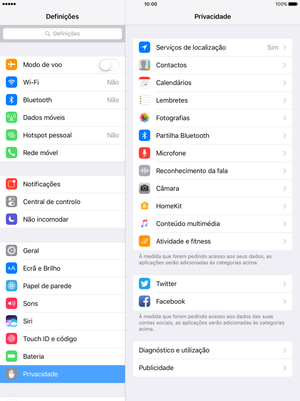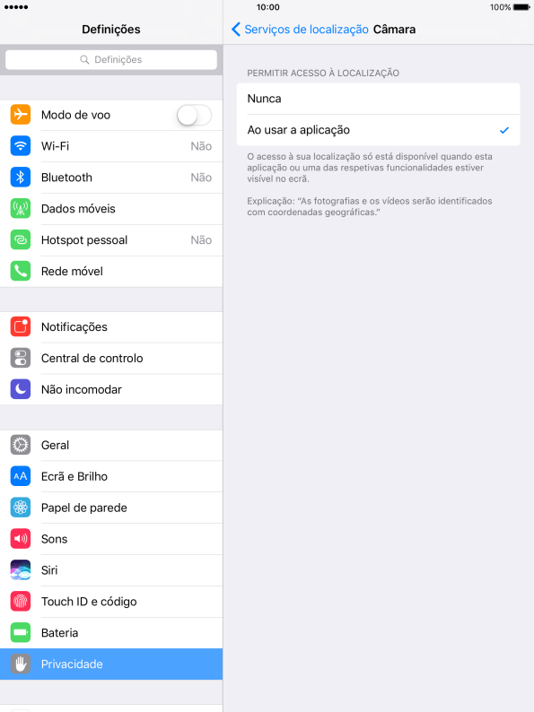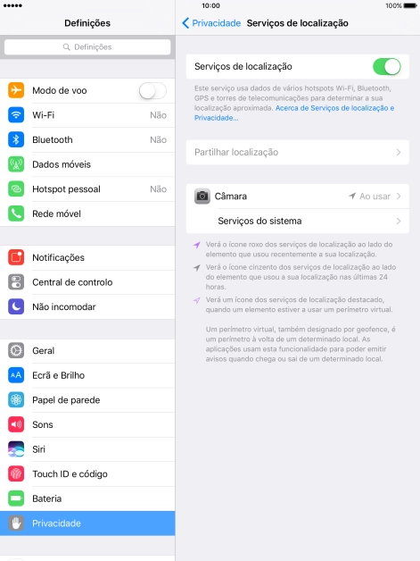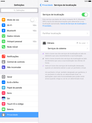 Prima o indicador junto a "Serviços de localização" para ativar ou desativar a função.