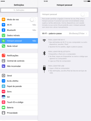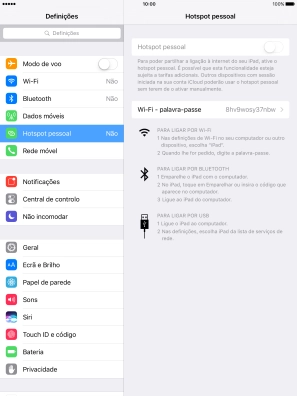 Prima o indicador junto a "Hotspot pessoal" para ativar a função.