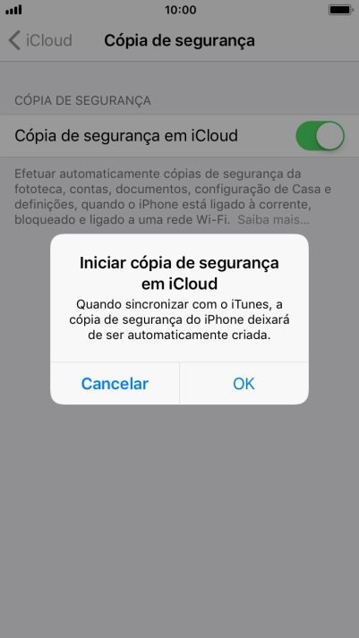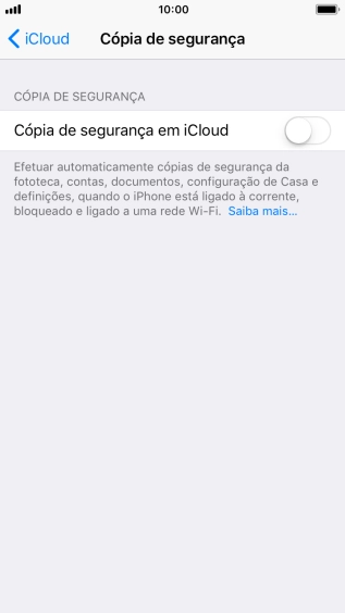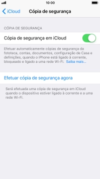 Prima o indicador junto a "Cópia de segurança em iCloud" para ativar a função.