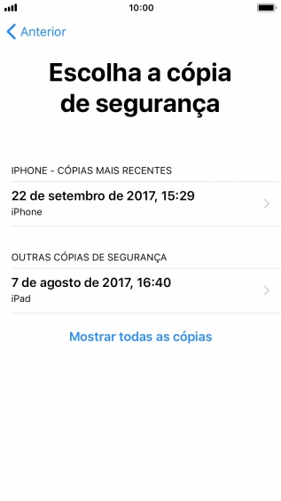 Prima a cópia de segurança pretendida e aguarde enquanto o telefone restaura o conteúdo a partir da cópia de segurança escolhida. Siga as indicações posteriores no ecrã para configurar o telefone de modo que este fique pronto a ser utilizado.