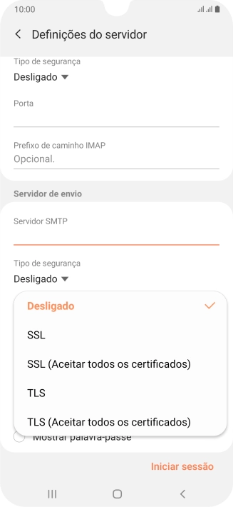 Prima o campo sob "Servidor SMTP" e introduza o nome do servidor de envio do fornecedor de e-mail.