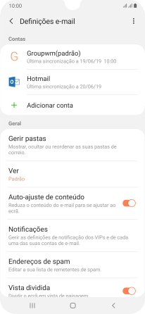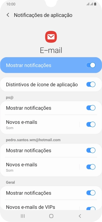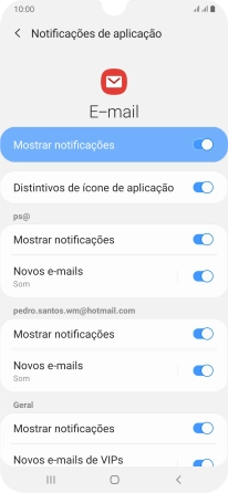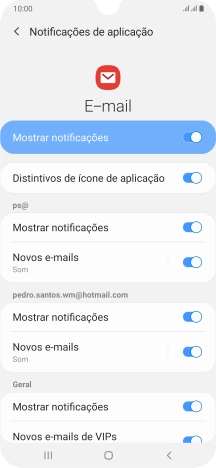 Prima o indicador junto a "Mostrar notificações” sob a conta de e-mail pretendida para ativar ou desativar a função.