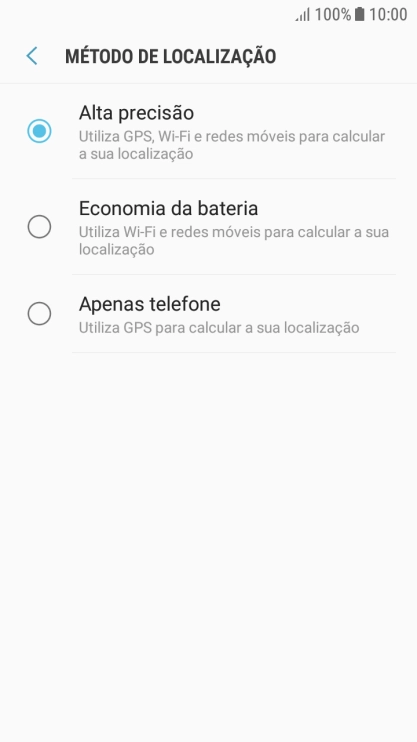 Se escolher Apenas telefone, o telefone irá encontrar a sua localização precisa, mas levará mais tempo uma vez que não utilizará informações suplementares da rede móvel ou das redes Wi-Fi nas proximidades.