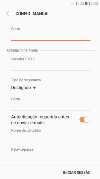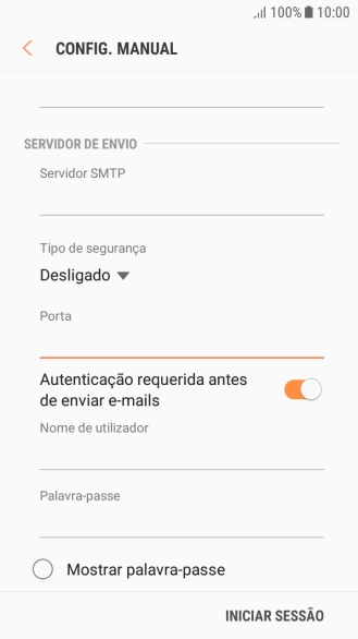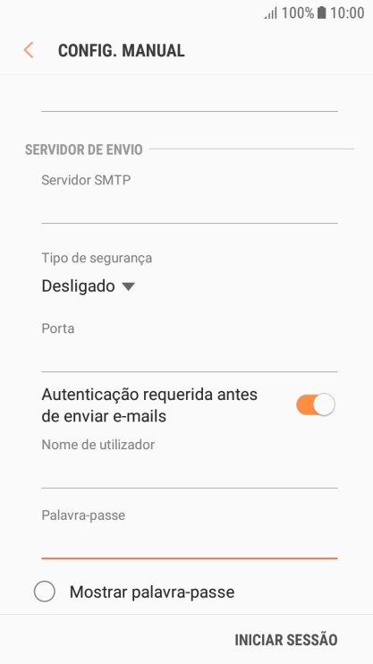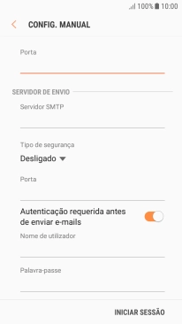 Prima o indicador junto a "Autenticação requerida antes de enviar e-mails" para ativar a função.