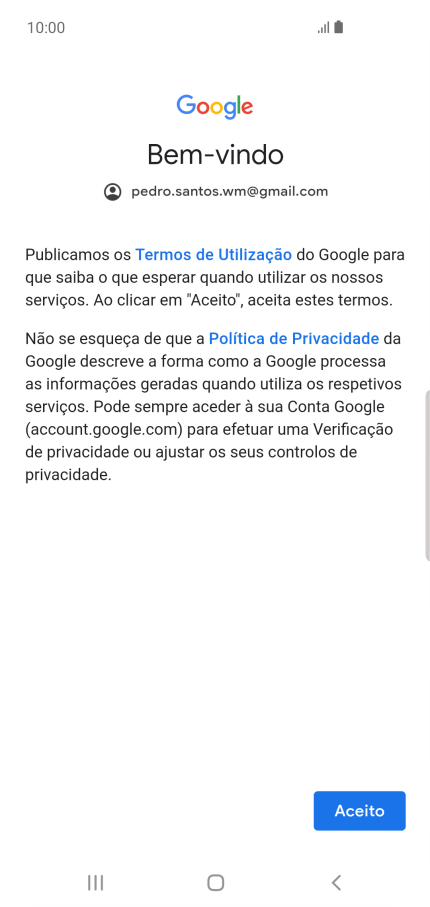 Prima Aceito e siga as indicações no ecrã para escolher as definições da conta Google.