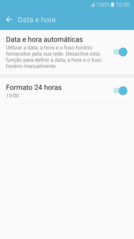 Prima o indicador junto a "Data e hora automáticas" para ativar a função.