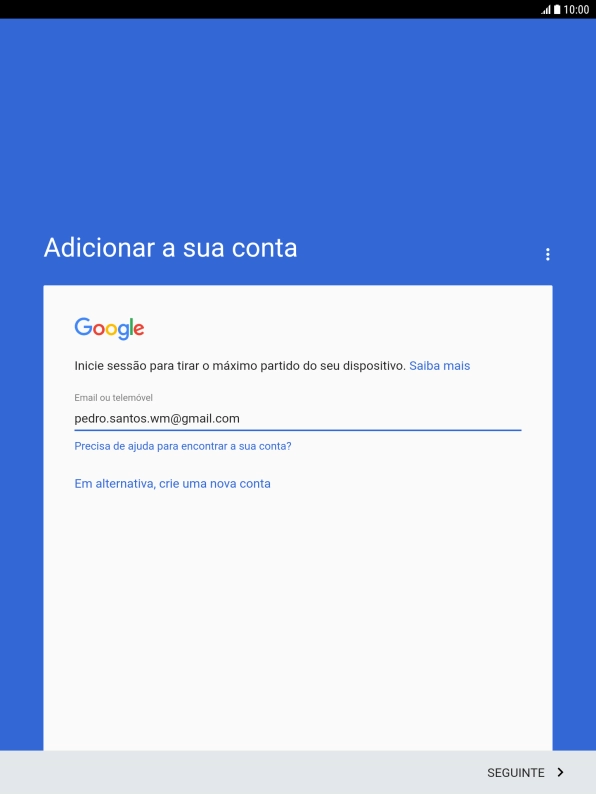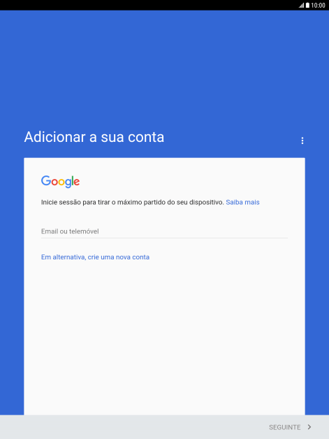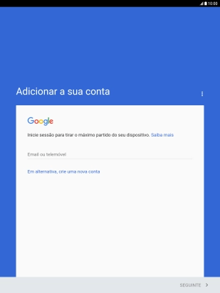 Se não tiver uma conta Google, prima Em alternativa, crie uma nova conta e siga as indicações no ecrã para criar uma conta.