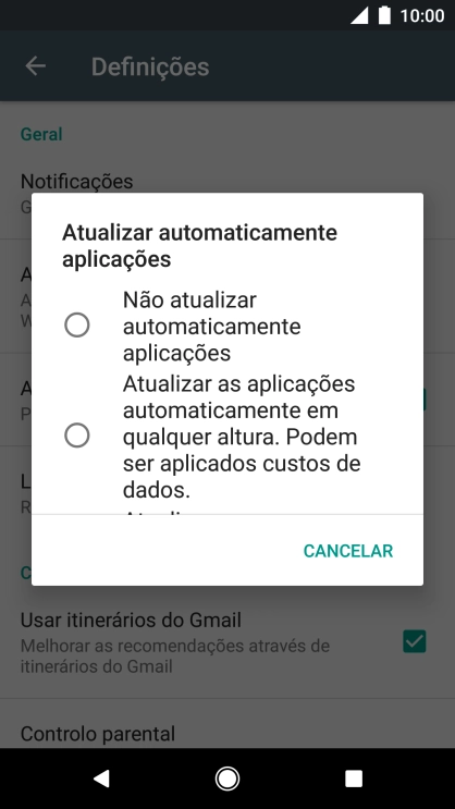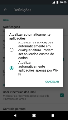 Para ativar a atualização automática de apps via Wi-Fi, prima Atualizar automaticamente aplicações apenas por Wi-Fi.