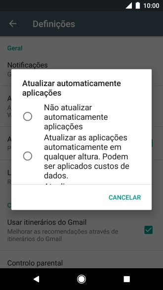 Para ativar a atualização automática de apps via redes móveis, prima Atualizar as aplicações automaticamente em qualquer altura. Podem ser aplicados custos de dados..